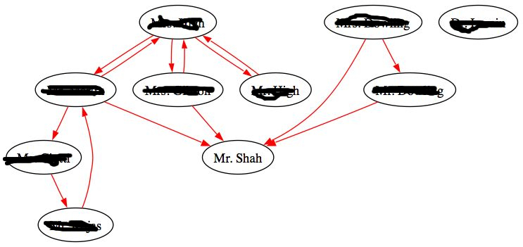 After class, I thought: why not do this whole social network thing next year? So last night I made up a fake set of relationships among teachers at my school and then created a network: