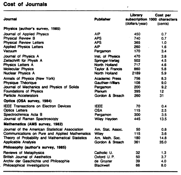 Henry Barschall, working for the American Physical Society and the American Institute of Physics, investigated the cost of science journal subscriptions for libraries. Even then in 1986 (as we hear is still the case now), science journals were increasing their prices — for a variety of reasons. And science journals were on average more expensive than journals in other disciplines (e.g. in 1985, the average yearly subscription for a science journal was $328, while for philosophy, it was only $47 — here).