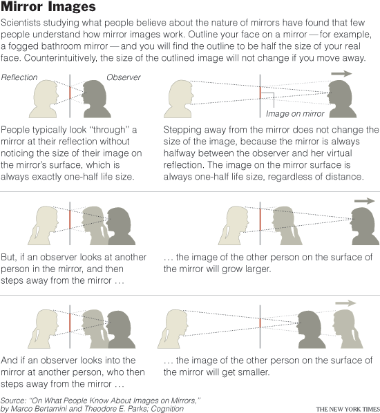 In a series of studies, Dr. Bertamini and his colleagues have interviewed scores of people about what they think the mirror shows them. They have asked questions like, Imagine you are standing in front of a bathroom mirror; how big do you think the image of your face is on the surface? And what would happen to the size of that image if you were to step steadily backward, away from the glass?