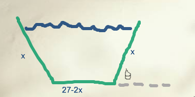 A length of sheet metal 27 inches wide is to be made into a water trough by bending up two sides as shown in the accompanying figure. Find x and \theta so that the trapezoid shape cross section has a maximum area.