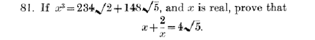 I might be missing something here, but…If I solve the 2nd equation as a simple quadratic, and then cube my solution, and come up with x^3 equals 234*sqr(2)+148*sqr(5), doesn’t that complete the proof? It appears that this only solves the converse of the problem, however, I will have demonstrated that the cube root of 234*sqr(2)+148*sqr(5) indeed satisfies the required 2nd equation.