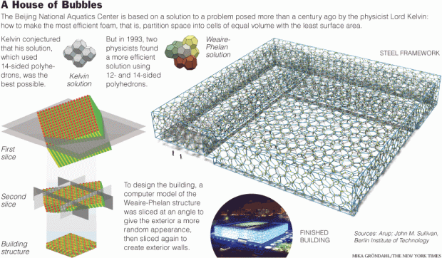 And this structure was the inspiration (and formed the basis) for the Water Cube in Beijing; we’ve come full circle. Surprising is the totally random look to the structure (like it had no order behind it). That was an effect achieved by taking a cube composed of the Weaire-Phelan structure, and then slicing it not horizontally, but at a 60 degree angle. See the excellent NYT graphics below.