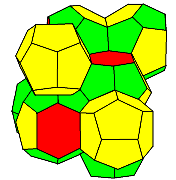 The Weaire-Phelan structure uses two kinds of cells of equal volume; an irregular pentagonal dodecahedron and a tetrakaidecahedron with 2 hexagons and 12 pentagons, again with slightly curved faces…. It has not been proved that the Weaire-Phelan structure is optimal, but it is generally believed to be likely: the Kelvin problem is still open, but the Weaire-Phelan structure is conjectured to be the solution.