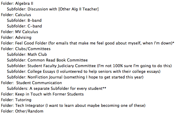 **I did this last year, and it was super useful. Every email to and from a particular student gets put in their individual subfolder. Also every email about these students (communication with other teachers, with deans, with parents, with the SFJC) gets put in these folders. Then, when I need to pull up information on a student, I have not only my gradebook, but in this folder, a lot of other information about them. Sometimes, when writing my narrative comments on students, I would quote them if they said something relevant. (As my school is a laptop school, you can see that we get a lot of email to/from/about students.)