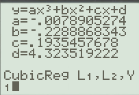 When you do the CubicReg command, you need to add the Y1 argument (above left). (You can get Y1 by following key sequence: VARS, Y-VARS, FUNCTION, Y1). Then it’s automatically entered in Y1 (above right).