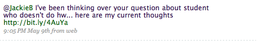 One: I joined twitter to be involved with the math teacher blogger community. Turns out, most of the people writing the blogs I follow regularly have twitter accounts. I didn’t know that so many people were on twitter before joining. So these people, who I sporadically communicated with by commenting on a post here or there, have become people I communicate more regularly with. I solicit ideas from them and I share my ideas with them. The dialogue, short and sweet, is continuous. Like a bird chirping in the electronic zeitgeist.