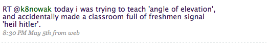 Four: Links, links, links! I post links relevant to the post I’m writing on my blog. But I tweet lots of random math links that don’t seem to fit in what I’m doing now. Cool things that I think other math teachers might find useful. And others do the same. When I first started twittering, this was hands down my favorite benefit. Plus I get links about non-math related things too. Like when someone linked to the entire 5 seasons of Angel which were on sale for $57 at Amazon for one day.