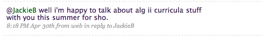 And that’s my story with Twitter. I can see how someone wouldn’t find it useful. But to the nay-sayers out there, I will say this: I went in thinking I probably wouldn’t find Twitter useful/interesting/fun. It was only after I was following math teachers and joining in the conversations did I actually say “hey, this is actually pretty rad.”