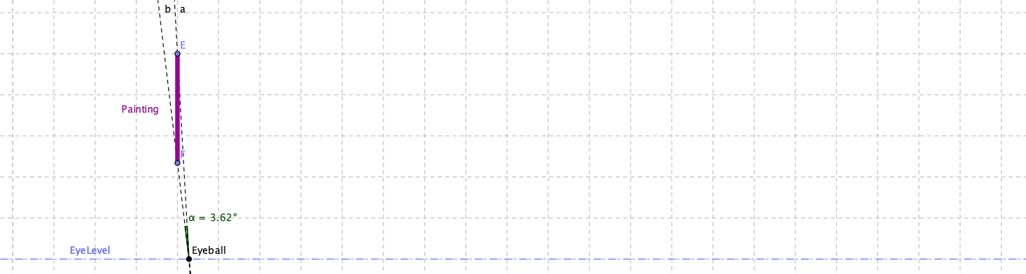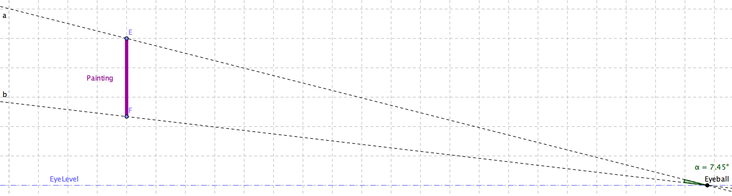 So to be clear, as you move the eyeball forward and backwards along the dashed blue line, what’s the largest angle you can create? Of course if you walk right up to the painting, or far away, the angle is going to decrease to 0. If you can’t see that, look at the diagrams below.
