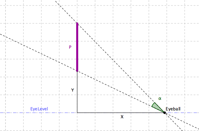 Using the Pythagorean theorem, one easily computes that X, the distance from the eye to the wall, equals sqrt(PY + Y^2). With this value known, our two formulas for Alpha are easily seen to be equivalent. Of course, one might consider it part of the problem to find X!