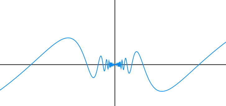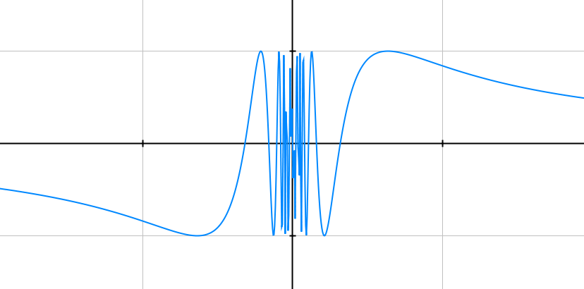 and saw that the zeros were getting more and more frequent as we approached 0. No matter how close we came to zero, we were still going to be bobbing up and down on the function. And crucially, we’ll be bobbing up and down between -1 to 1.