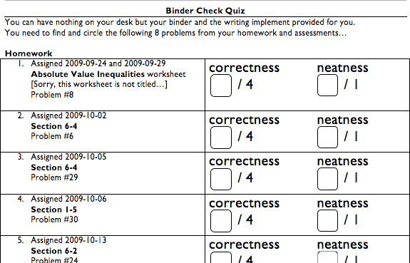 [2] For the 2 binder checks in the first quarter, there were about 8-10 things students needed to circle, including not only problems from homework, but also problems from assessments.