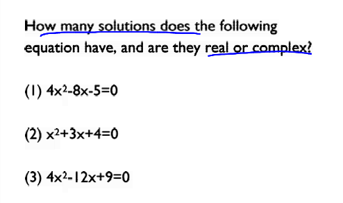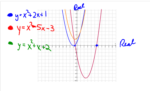 I introduce the discriminant, b^2-4ac and we talk about where we’ve seen that (answer: in the quadratic formula). I tell them they will soon see the use of it. But first we should get familiar with it. [1] We calculate it for a few quadratics. And then I asked them “so what? what does this thing tell you?”