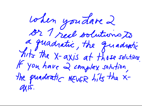 A few hands went up, and then I should have had them talk in partners. But I didn’t. I called on one, who said “there will be i.” “What do you mean?” “The solutions will have imaginary numbers.” “Right!”