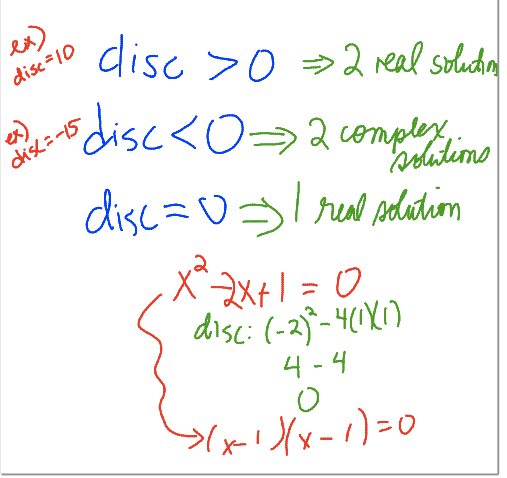 I’m hankering for someone to ask the obvious next question, and indeed, a student does. “What happens if the discriminant is 0?”