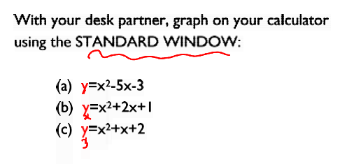 At this point, I haven’t pointed out the x-intercepts, but I asked students to see if they can relate the two questions. I grow a bit impatient, and I point to one x-intercept, and then the other, for the x^2-5x-3=y equation. Hm. They start to see it. We then look at the x^2+2x+1=y equation. Finally, the x^2+x+2=y equation. Which doesn’t have any x-intercepts. Which confused some.