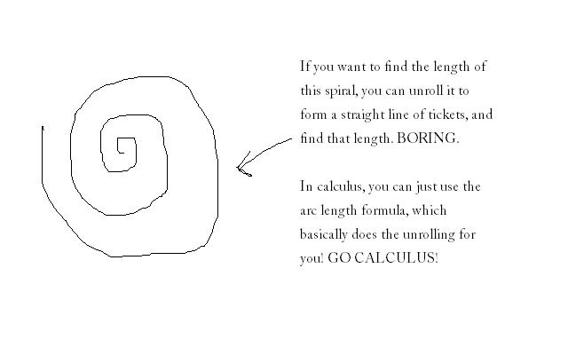 Regardless, the whole point here is if we can find a function to model the tickets being wound around and around and around, we can just apply the calculus arc length formula and find the length of all the tickets if they were rolled out!