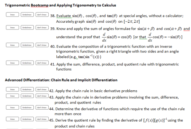 So I’ve tended to do C. I let my kids spend the class time any way they want. I give them a list of topics (or because I’m doing SBG in calculus, I give them a list of skills) and ask them to classify them as “know” “kinda know” and “don’t know”