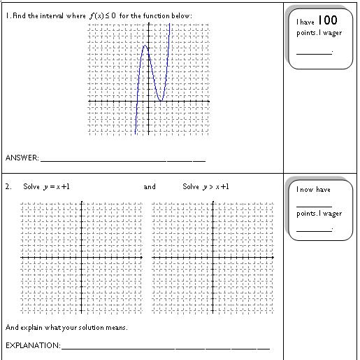 To set it up, I talked to my kids explicitly about how the purpose of the exercise was to review, but also to be hyper-conscious about what you actually know (versus what you think you know). I put kids in pre-chosen pairs. And each pair got a booklet of the Quadratics and Inequalities Review Game (each page was cut in half and stapled). Below are the first two questions from the game.