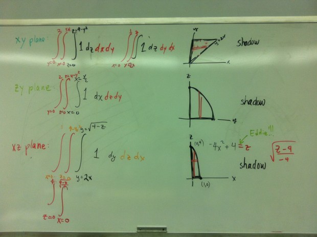 6. Three of my multivariable calculus students — one with an iPhone, a blackberry, and a droid — wanted to decide which one took the best picture. So each captured our triple integral lesson on their phone, and me and another teacher picked the best. The winner: