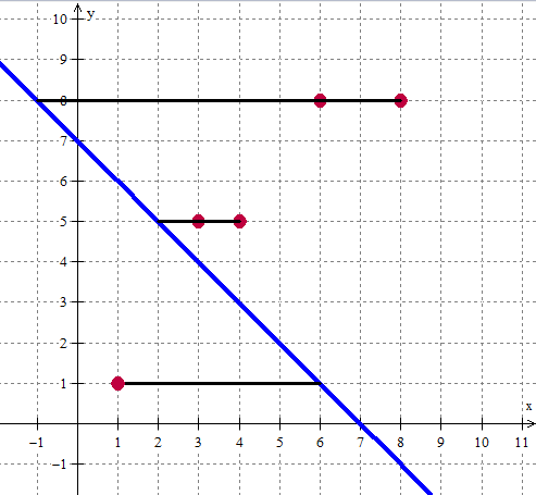 So we could use the sum of the perpendicular segments as our measurement. To find the line of best fit, we would say that we have to try out ALL possible lines (there are like, what, infinity of them? hey, you have study hall…) and find the one with the lowest sum. [1]