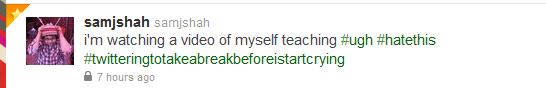 But I’ve held, for about two years now, that I felt that video analysis of teachers is actually going to be the most powerful and next form of serious professional development… So I’m trying to overcome my fear, and so I asked a couple of our mathemablogotwittersphere cabal to watch my video and send me feedback. It’s terrifying. I feel like my blog gives one big false impression of who I am as a teacher (read this), and so it’s scary to think that people who I respect a lot will suddenly think: WTF this guy sucks.