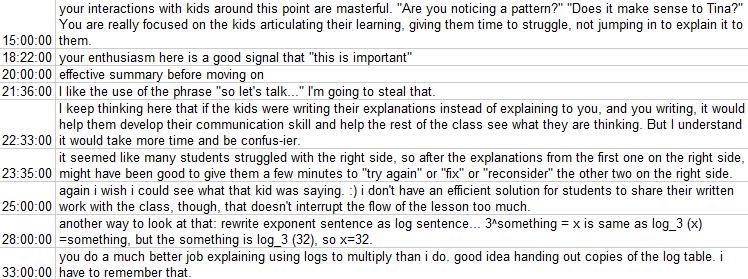 (4) I don’t know if sharing 50 minutes (a whole class) was worth everyone’s time. I wonder if picking a 10-15 minute clip and having the reviewers focus on three things (e.g. my questioning, my body movements, the students engagement) would have worked better. It’s hard to know exactly what to do with all the feedback I got, because it’s not targeted. It would make sense to have some particular things I want to work on, and get feedback just on those. Also, making explicit what I need to work on makes the notion of getting negative feedback less nervousmaking, because I already have admitted to everyone “I suck at these.”