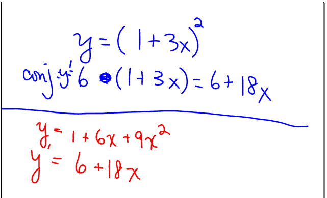 So now we had proved something about the derivative of y=(1+ax)^2, and I asked them: would it work to the third power? would it work to the nth power? And I left it as an exercise for their home enjoyment (our corny term for homework). I’m really curious to see who gets how far on this!