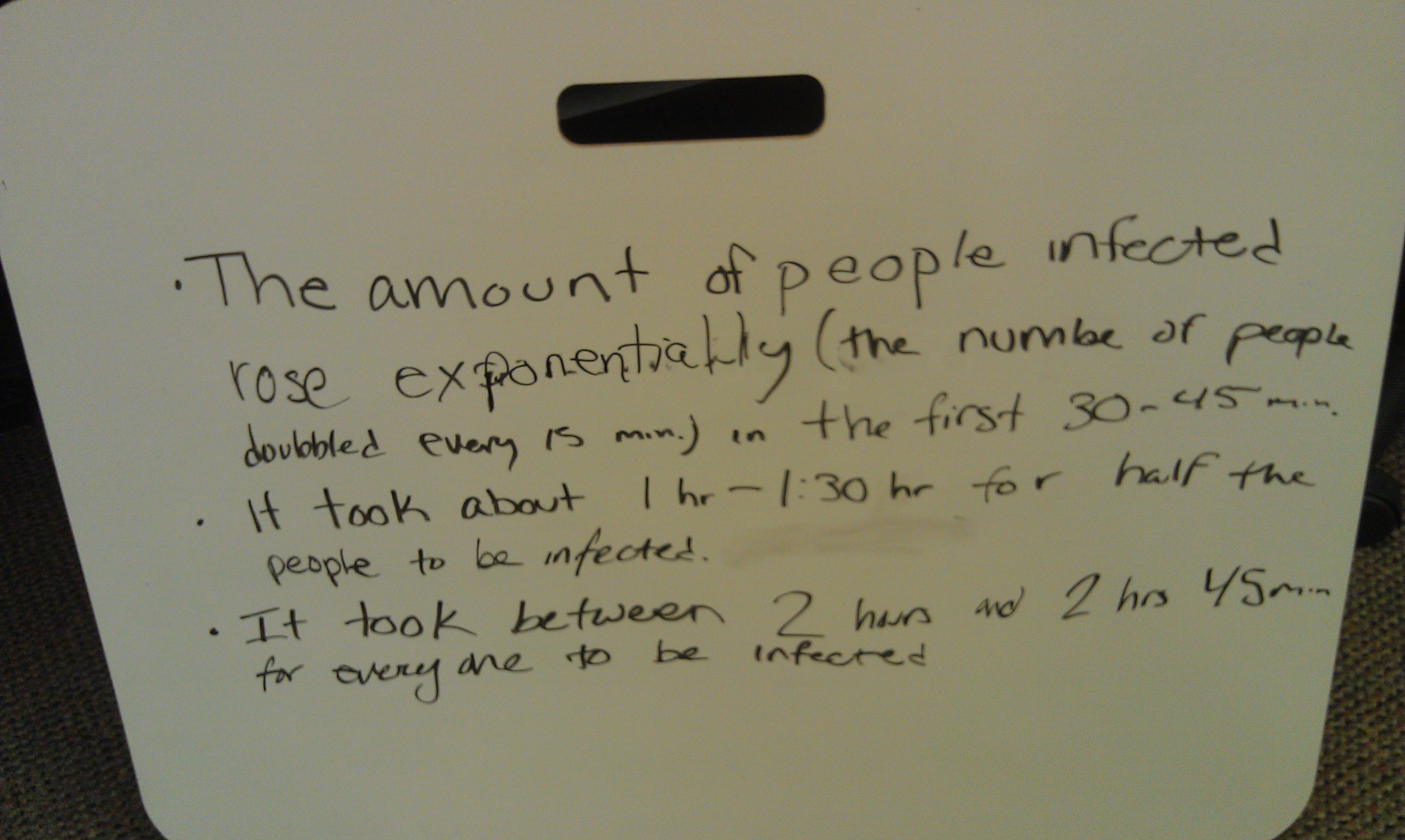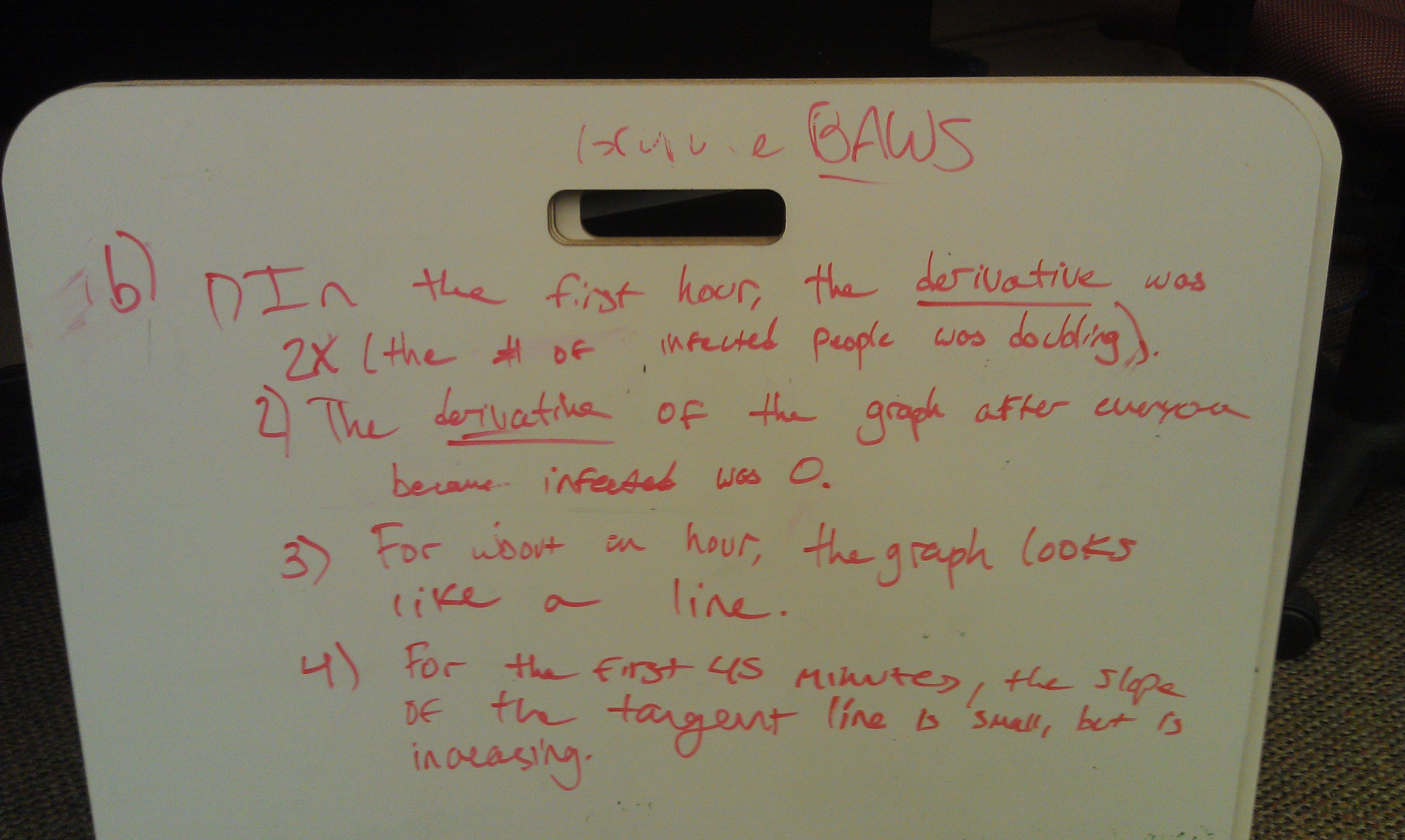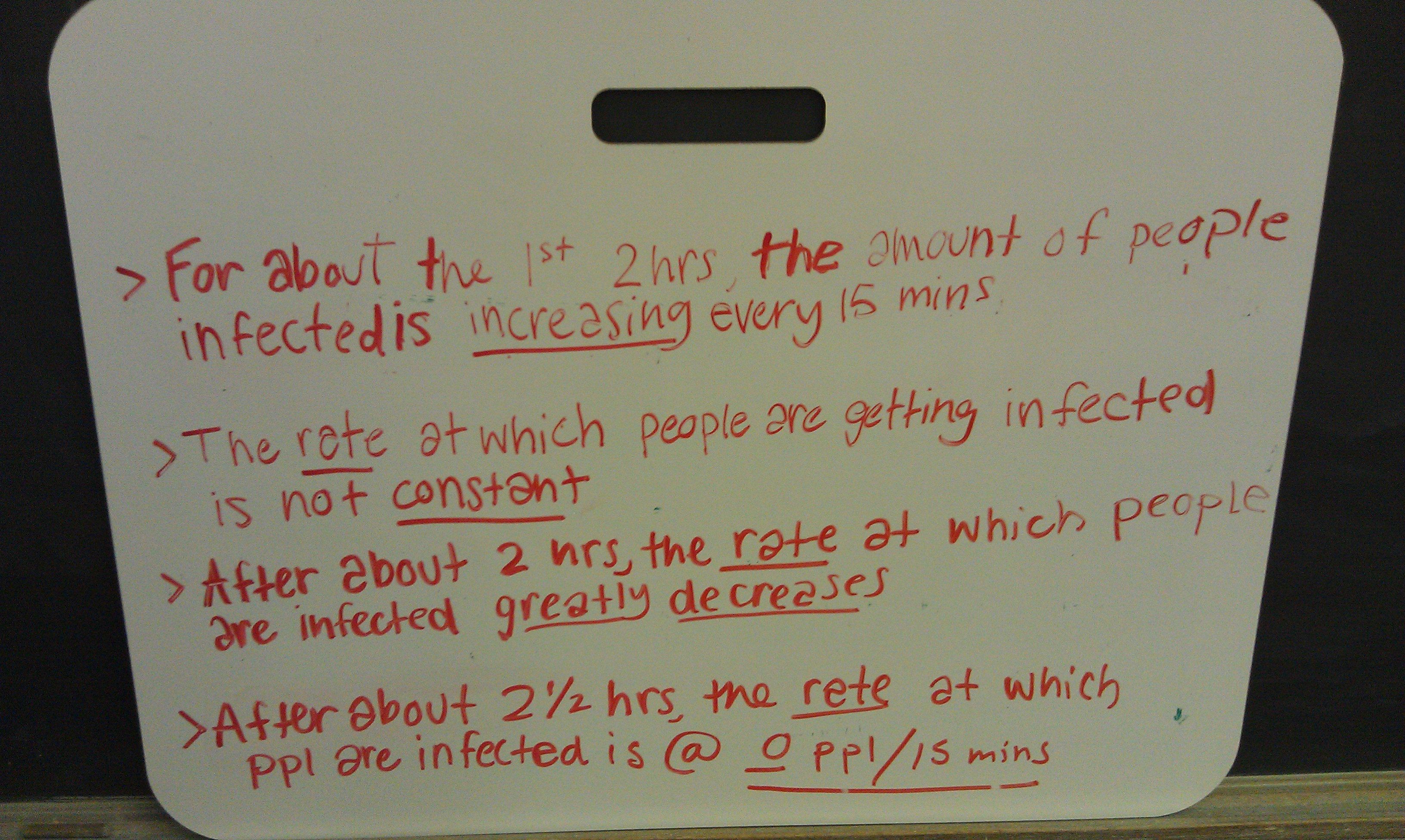 And they had such great observations. Some groups picked up on that change where the function was increasing in one way to increasing a different way. Others talked about how the rate of change (of infected over time) was greatest. Others talked about how the function was “exponential” for the first thing, seemingly linear for the middle third, and “something else” for the last third.