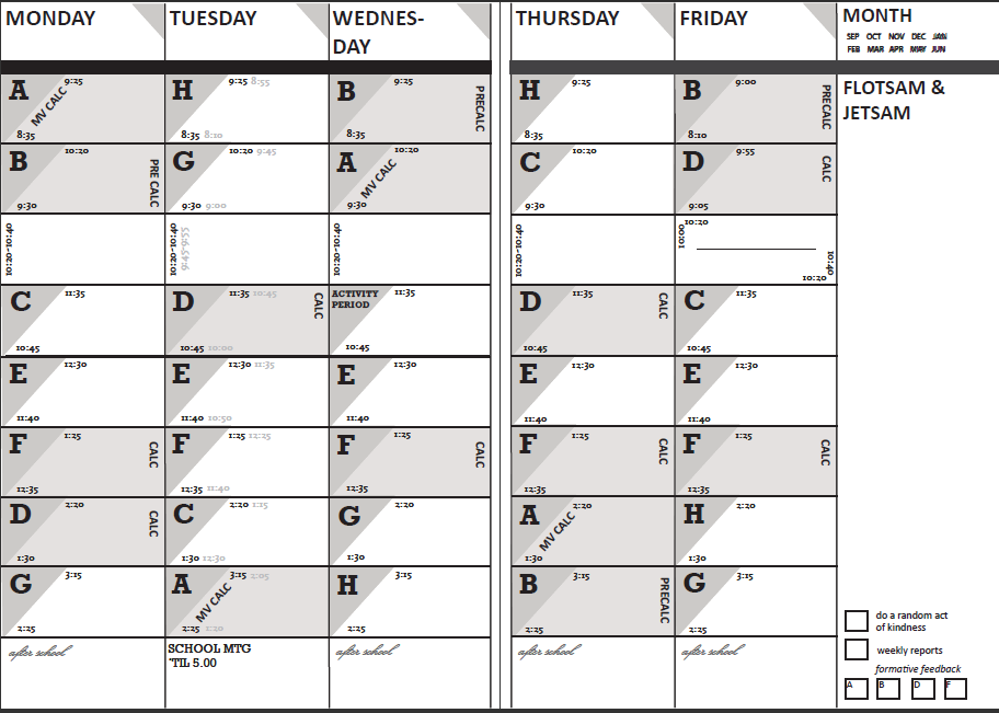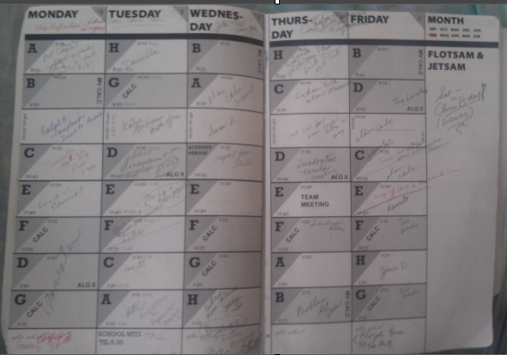To help me out, I designed and published my own 88-page weekly planner. A copy of my weekly schedule for 2012-2013 is below (missing, of course, the 10th grade team meeting, the two “duties” I will be assigned, math club, and the weekly meetings I have to schedule with the other Calculus and the other Pre-Calculus teacher… so don’t be so jealous of all the free time… it’s really not there.)