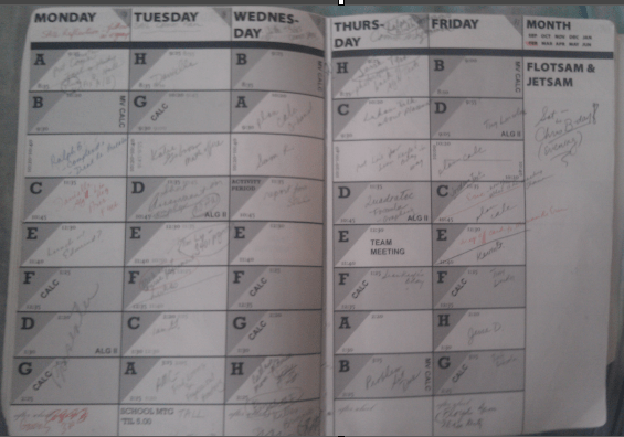 Anyway, I’ve posted about this each year. I figure I’ll do it again. My school has a rotating schedule, where we meet kids four times a week (50 minutes each). We’ve had this schedule for the five years I’ve been teaching at my school, and I still don’t know it by heart. I have gotten the class period start-end times down, but which class I’m meeting when is always a mystery. Also, with my brain, scheduling meetings with kids is something that has to happen in my planner so I don’t double book.
