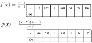 What’s nice is once they get that distinction down, we look at the graphs and see that we have a missing point. Which is simply the one point where the function is undefined. So when I ask them why the graph of looks like the line