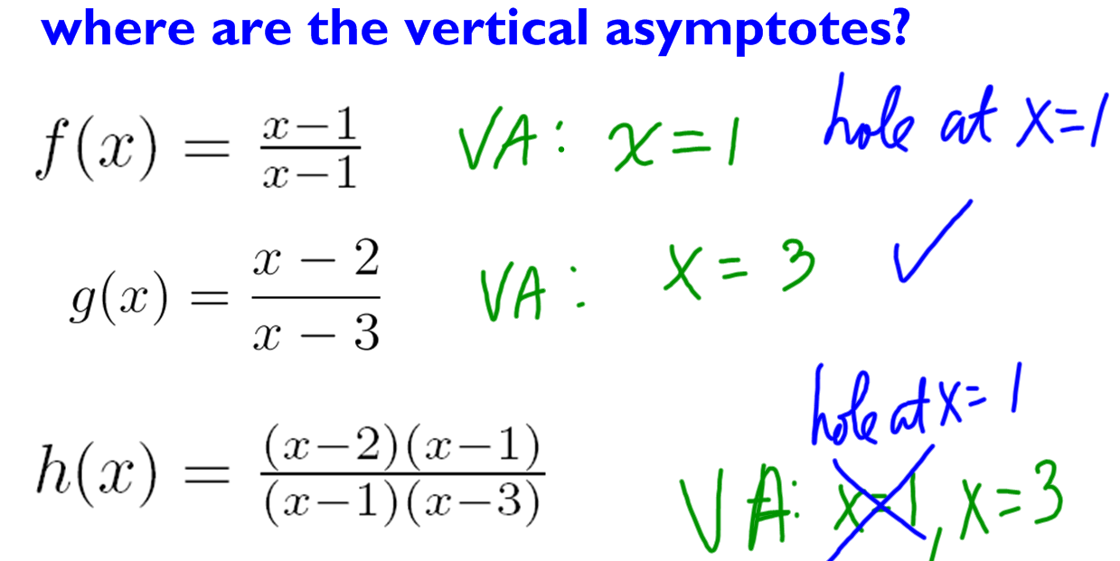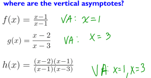 … and talk about how it is not sufficient to say that vertical asymptotes occur when the denominator is zero.