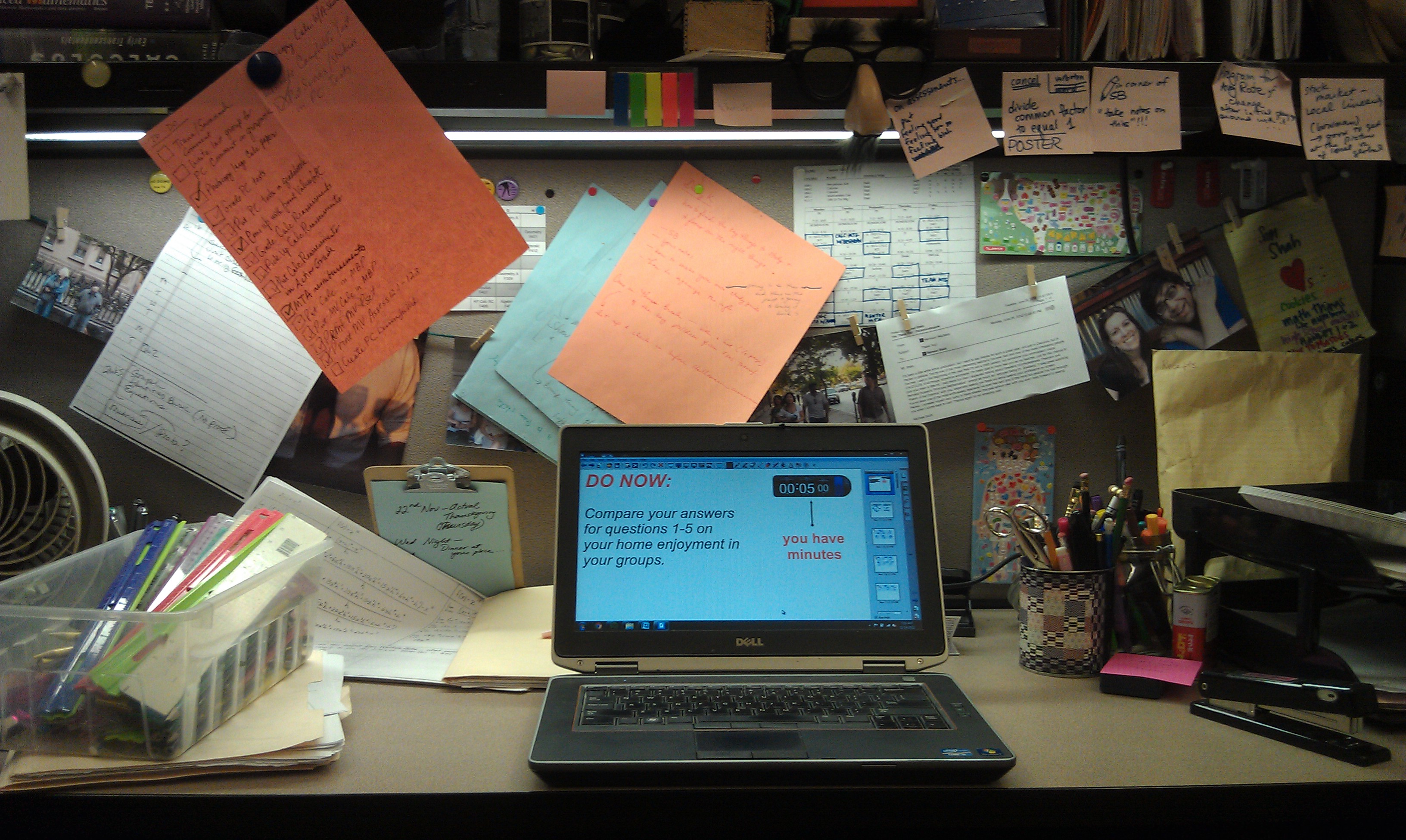 6:57am: I arrive at school. I huff and puff up the stairs to the fourth floor, and as usual, there are two other math teachers already there working. These two colleagues of mine arrive super early. They are super human. And they live farther away from the school than I do. Dedicated. I hunker down at my desk and think “Okay. Okay. It’s going to be okay. You have one hour to get things together.” I focus. I spend the next hour crafting a SmartBoard for the Precalculus lesson I have to give first period. I had already pretty much planned in my head, but it needs to be made concrete. It’s not all that glamorous, but it is organized, and will make sure that students are in a classroom where there is a flow and there is a clear direction to what we’re doing. Part of the class involves students creating their own “unit circle” so I put colored pencils, the blank template they will be using, and a ruler in each group’s folder (this saves me time in class). As it’s gets closer and closer to the start of homeroom, I get more and more stressed out about finishing everything. But I do finish everything.