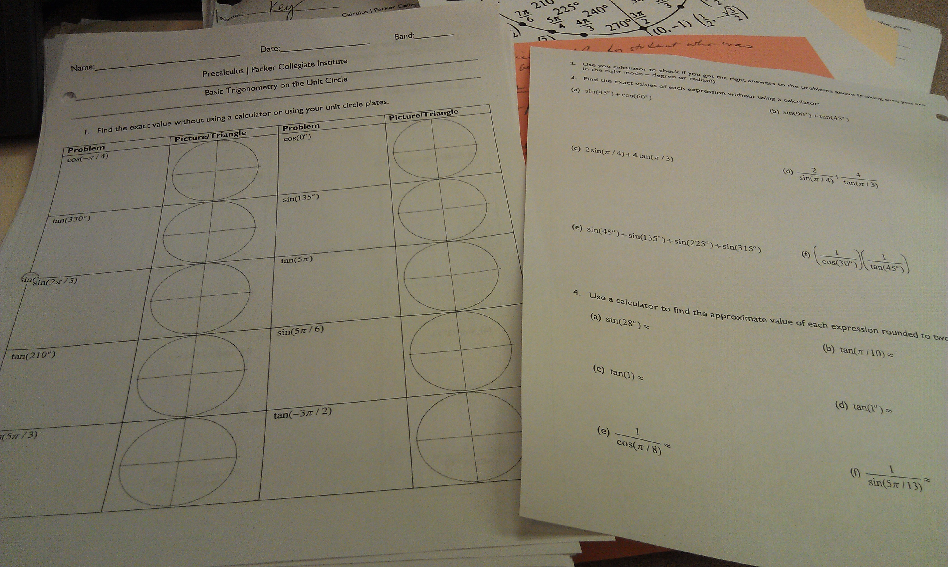 10:20am: It is now time for break, which is 20 minutes. In this time, I do a number of logistical tasks. I convert my SmartBoard notes to PDFs and post online for kids to access. My computer kept not wanting to convert things to PDFs and I have a whole interior monologue cursing SmartBoard. It finally works. I post the homework for kids to access. I removing the rulers that we used today in constructing our unit circle from the precalculus group folders. I write up the answers for the work that I collected from my precalculus students, so that I can start grading their work. Just as I finish, break is over.