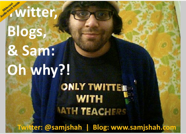 Here is the abstract: In the US, professional development (PD) is typically something done to educators, not with educators. Traditional PD often comes in the form of some mandated process or product educators are expected to use in their teaching. This external approach can be very limiting, isolating, and disempowering. Social media offers educators an alternative to “PD as usual.” Using various online platforms, educators connect with colleagues across the world. They share teaching ideas and seek feedback. Not only do they grow professionally but they also contribute to further developing the profession. We want to share how we use social media to engage in our own form of sustainable, personalized, professional development. This includes connecting with other professionals on Twitter and sharing resources through links to blogs and Pinterest. Last July, a group organized their own Twitter Math Camp in St. Louis in order to meet and share ideas face-to-face. These are the stories we want to share in this session.