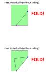 And a few groups were also noting that when you unfold the paper, there is something really remarkable about the bottom of the page, with the two creases emanating from that point (which is the vertex of that 90 degree angle when folded). They noted that somehow — by folding up the two triangles — they are splitting the bottom of the page (a 180 degree angle) into three angles, where the middle angle is always 90 degrees.So they have a 90 degree angle, and then two smaller angles that add up to 90 degrees. I said: that’s awesome. Now how do you know that middle angle is 90 degrees, no matter where the creases are? (As of yet, no kid or group has explained this halving.)