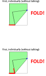 A few groups noticed that the two folded triangles looked like they were always similar. (Indeed, I had totally missed that when I first did this problem…) Some kids were able to come up with the logic that if the triangles were similar, then they could actually prove the bottom point was 90 degrees. Loved it! (As of yet, no kid or group has proved that the triangles are similar.