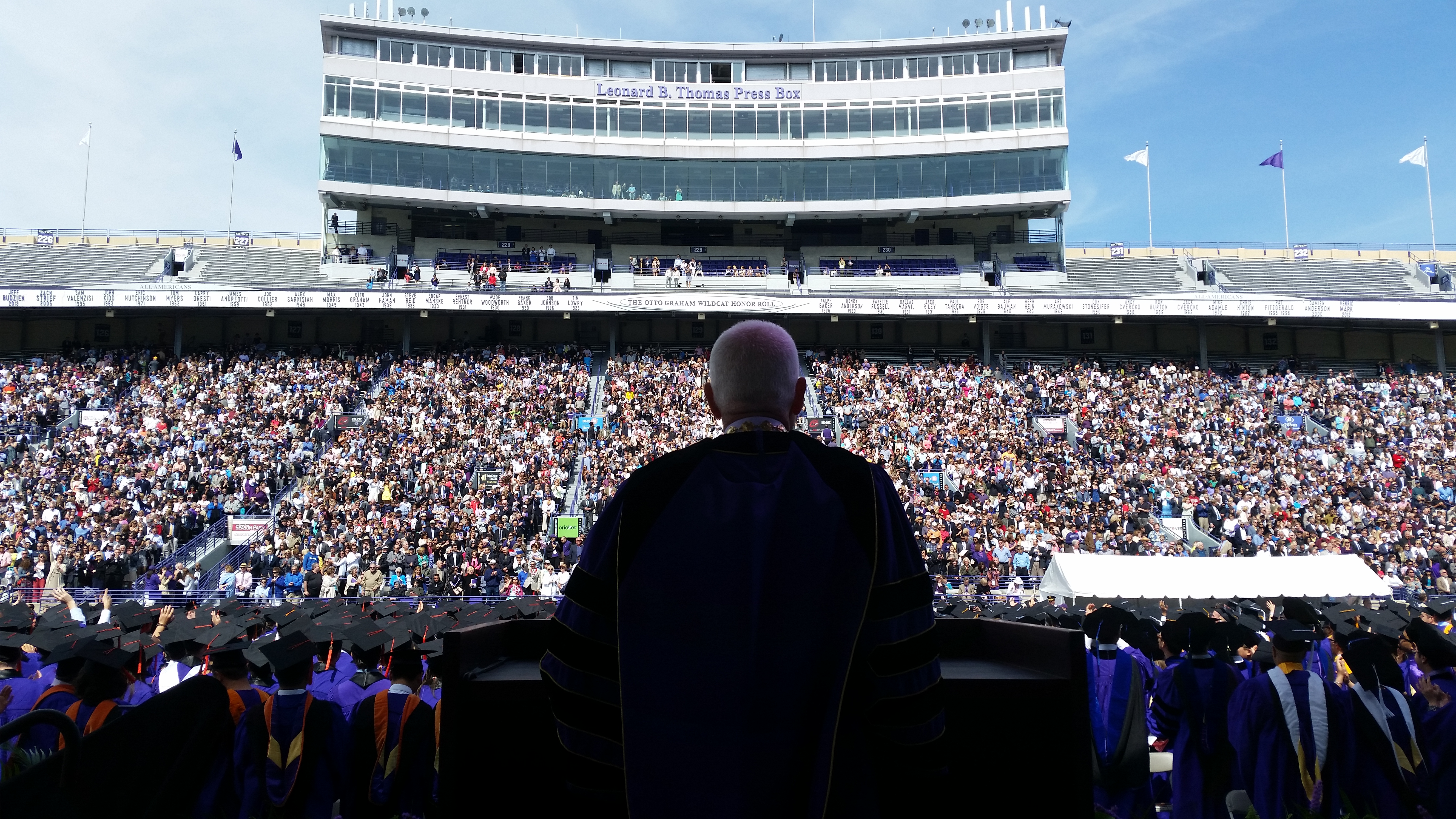 A former student who was a senior graduating from Northwestern nominated me by writing a reflection about her experience in our calculus class. I then was asked to submit some letters of recommendation and a teaching philosophy / personal statement, which I did. I actually wasn’t going to — another thing on my plate! — but I started thinking how lucky I was to have a former student take the time to write something up about me, and I figured I could put in a couple hours of work to honor that. A few months later, I received an email saying I was a semi-finalist, and had to do a 1 hour video conference interview with six people (administrators, professors, and students at Northwestern) — and that video was then shared with the whole selection committee. Scary!!! I did it, but was a rambling nervous fool. And then: I got a call telling me I was selected, and that I was going to be attending Northwestern’s graduation and be feted.