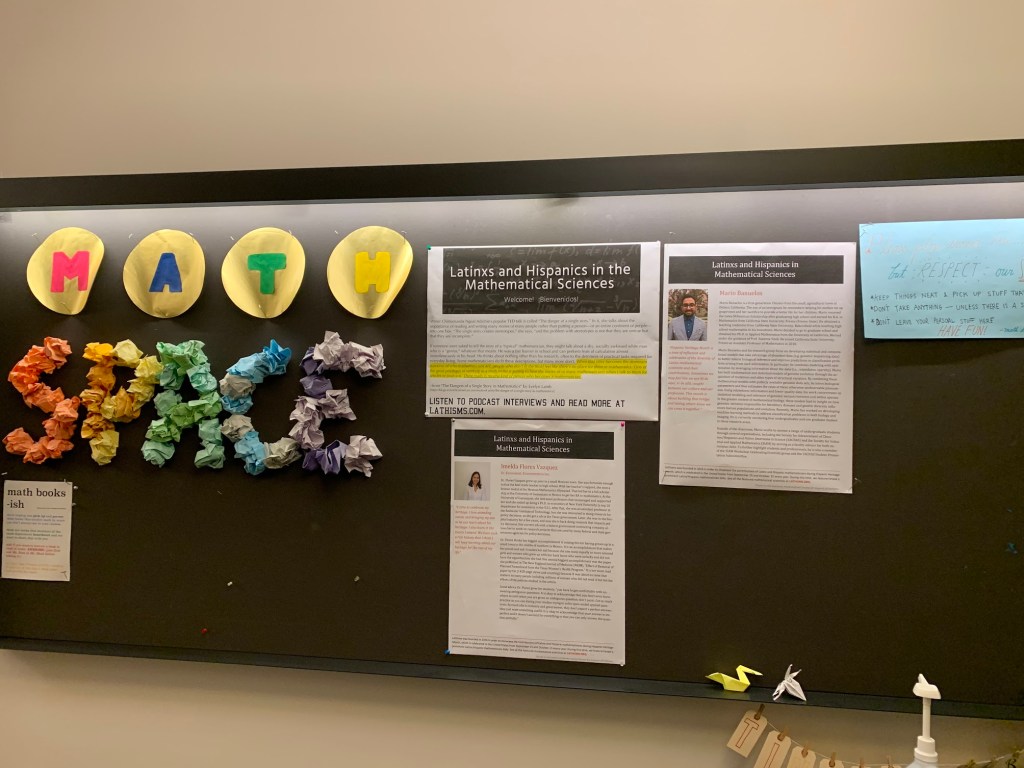 At our school, another teacher and I created a “Math Space” outside of our math office. (Read more about that here.) Since we’re now in COVID-times, we don’t have the table and stools there for students. But we still have the bulletin board. So I printed out two of the posters from the Lathisms site, and created my own poster of a passage from Evelyn Lamb about why we should care about these stories.