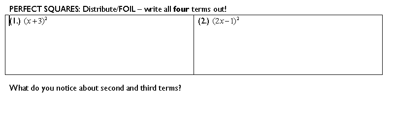 We talked about what a perfect square is and noticed a relationship between the four terms — when you FOIL. Importantly, students are going to see that the second and third terms are the same.