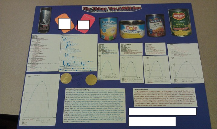 * In general, optimization was my favorite/most memorable part of the quarter. It’s probably the only math I’ve ever done that requires logical, real world thinking at every step (for example, who cares about the optimization of the graph when it’s less than x=0, because you can’t have negative distance). In the past, I’ve felt that a lot of math does correlate closely to things in the real world, but this is the first time where it’s so clear how everything relates. That said, I felt like the can project went extremely well, considering this is the first time it was done in this class. I felt like I totally understood everything that was going on, and I enjoyed taking measurements, doing calculations, and seeing how much the lima bean companies were ripping us off (hint: they’re not! It’s the tuna companies that are evil). The only change I would suggest is allowing one or two days more of time to finish it. Although we got all our measurements and calculations done, the most difficult and lengthiest part of the project proved to be printing everything out, cutting it, and creating the poster.