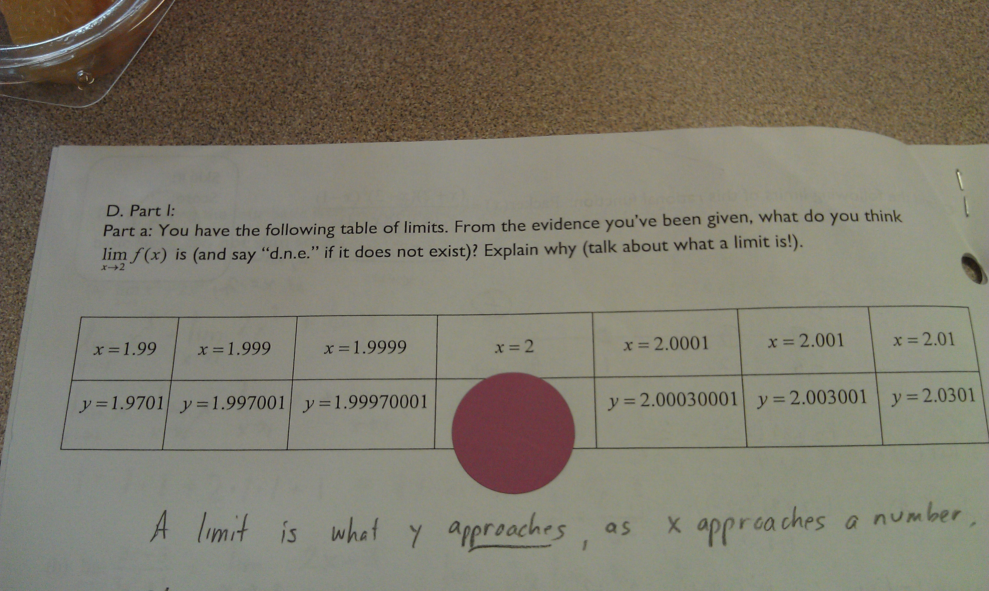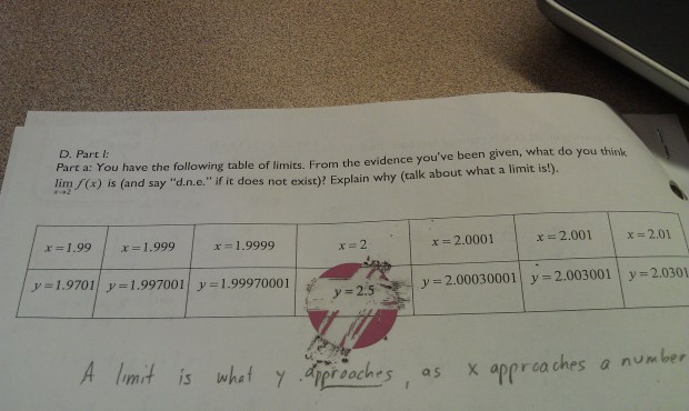 My conjecture was pretty spot on. Let me tell you the responses are fascinating. So far my conjecture seems to be holding water. And it’s just the most intriguing thing to read the responses from students who got it wrong. The phrase that springs to mind is cognitive dissonance. There are a number of kids who are saying two totally contradictory things in their explanation, even from sentence to sentence, but they don’t recognize the contradiction. They’ll say “a limit is what y is approaching as x is approaching a number, and doesn’t have anything to do with the value of the function at the point” and then in the next sentence say “since the value of the function at x=2 is 2.5, we know the limit of the function as x approaches 2 must be 2.5.”