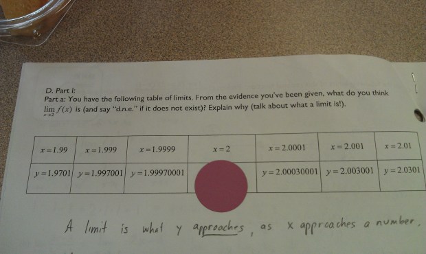Which reads: “Scratch off the missing data. With the new information, now answer the question: What do you think the limit as x approaches 2 of the function is (and say “d.n.e.” if it does not exist)? Explain why (talk about what a limit is!).