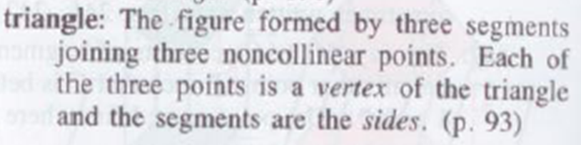 Triangle: “A triangle is a 3-sided, 3-angled shape with straight lines that connect to the endpoints. Also, all the angles add to 180 degrees.”