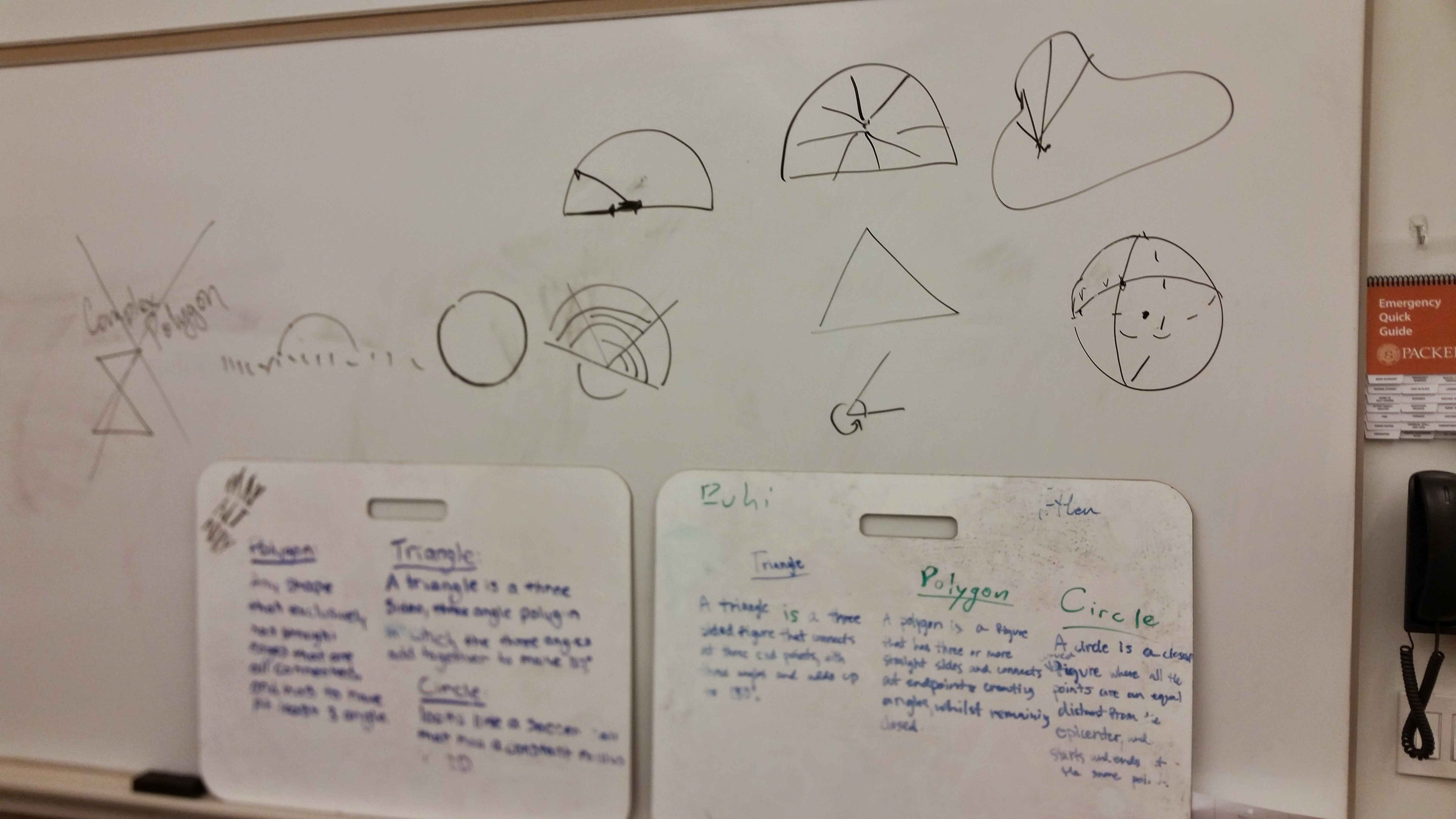 The ending of our first unit involved students coming up with their own definitions for the bunch of quadrilaterals (kite, dart, square, trapezoid, rectangle, rhombus, convex quadrilateral, concave quadrilateral, isosceles trapezoid, parallelogram). This opening activity was designed to make that exercise easier when we got to there. Specifically, it was designed to show them that clear and precise language is important to communicate your ideas, and it isn’t easy to come up with clear and precise language. Things that we “think we know” are really quite hard to pin down… Like what a circle, triangle, and polygon are.