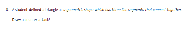What was awesome was the subtleties they ended up talking about when trying to find the counter-attacks. When talking about the circles or polygons, for example, they realized that we have to say this is a 2D figure, otherwise there are many other curves that would work. When talking about triangles, saying the figure had three angles was problematic because there are 3 interior angles and 3 exterior angles. For triangles and polygons, students realized how crucial it was to say that the figures were closed. I was so impressed with how they were really trying to attend to precision in this task.