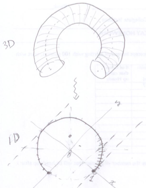 One of his objects is going to be something like 2/3 or 3/4 of a foam torus. He was having trouble finding the center of mass of it. The first thing we did was simplify the problem — changing the 3D foam figure of uniform density into a 1D bent wire of uniform density.