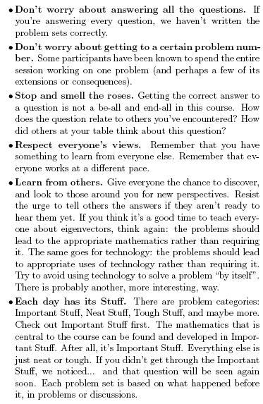 The problem sets themselves were the most well-crafted set of problems I’ve ever been given, in terms of scaffolding. I don’t think you can see really how these problems are so amazingly scaffolded until you actually work through them. Because you will start seeing cycling back to old material, little hints about connections you’ll be making (no connection was ever explicitly given to us in the problem set — we had to do all that heavy lifting on our own), and a general ramping up to some really frustratingly engaging problems.