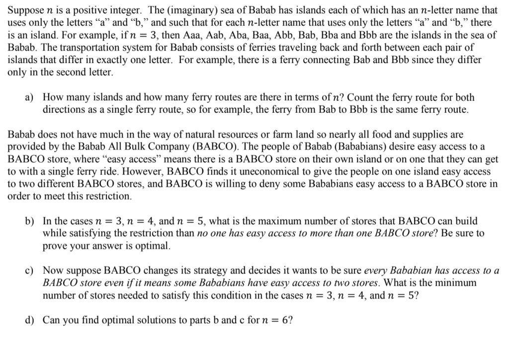 This is from the 2019 entrance questions for a summer program. I think I was able to successfully solve (a) and (b). And then I think I solve (c) for n=3 and n=4 (and got an answer for n=5, but haven’t proved it is optimal). And I have no way to even start thinking about (d). But what I thought was lovely is how many different places my brain when went trying to think through this problem. And the neat geometric structure that arises out of the setup. (Even though I wasn’t able to fully exploit this structure in my thinking.)